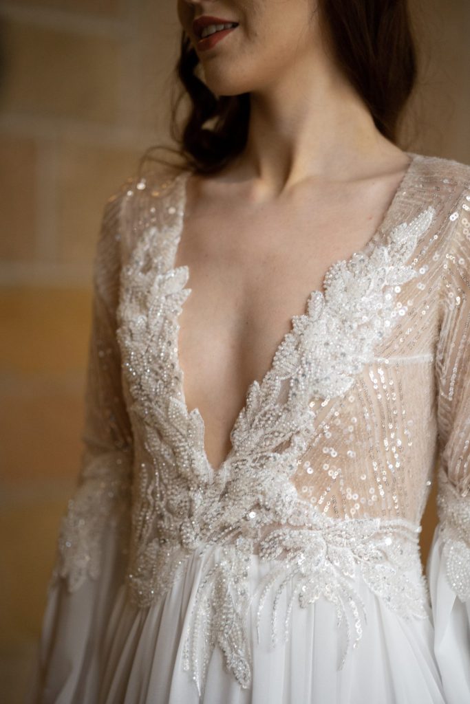 • Cuerpo en tul nude bordado con pedrería blanca y lentejuelas, ajustado y con escote en V profundo.