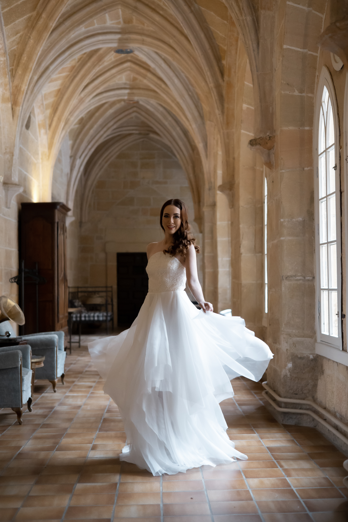 • Capa de 3,5 metros en organza de seda, el largo se puede ajustar al deseado por la clienta.