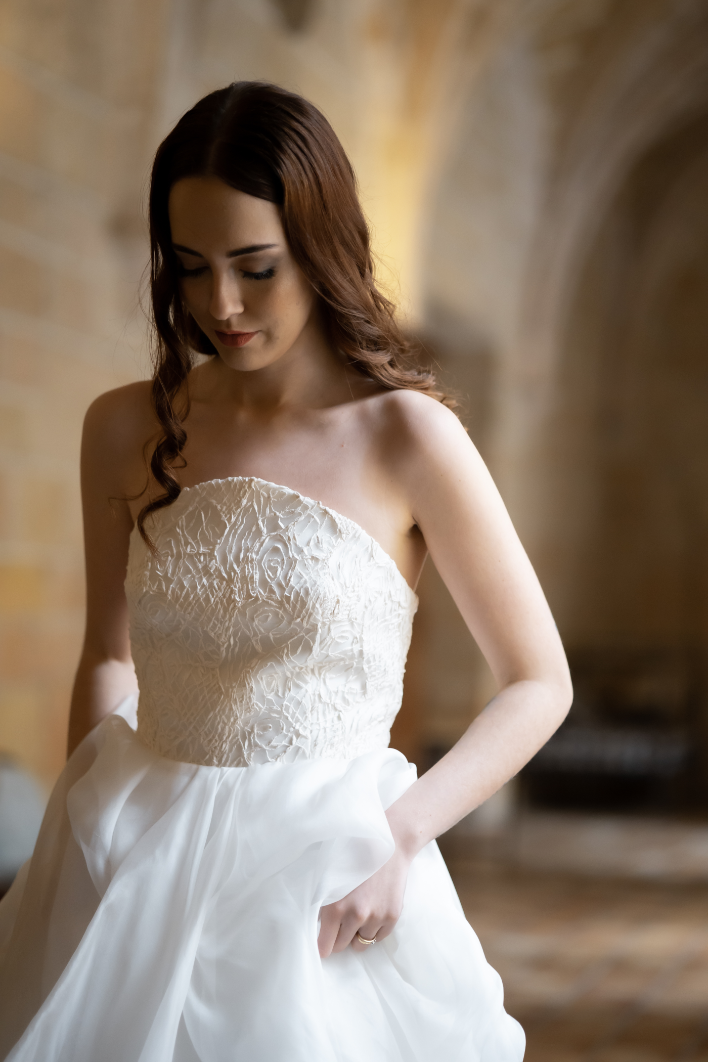 Iris exige equilibrio entre técnica y emoción. El patrón se construye capa a capa, para lograr un efecto de transparencia controlada que complete los volúmenes. El resultado es un vestido que se recuerda antes incluso de haberlo tocado.
